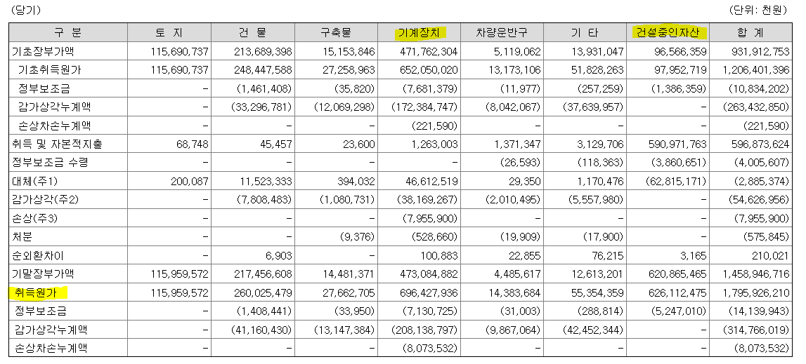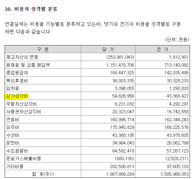 연결재무제표 주석을 참고하면 다음과 같이 감가상각비도 어느계정에 포함시켰는지 확인가능하다