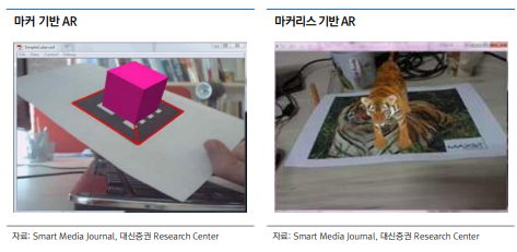 마커리스 방식 : 동시적 위치추적 및 지도작성(Simultaneous localization and mapping; SLAM)을 활용하여 카메라에 들어온 정보를 바탕으로 가상 지도 작성 및 가상 지도 내 사용 자의 위치 추정